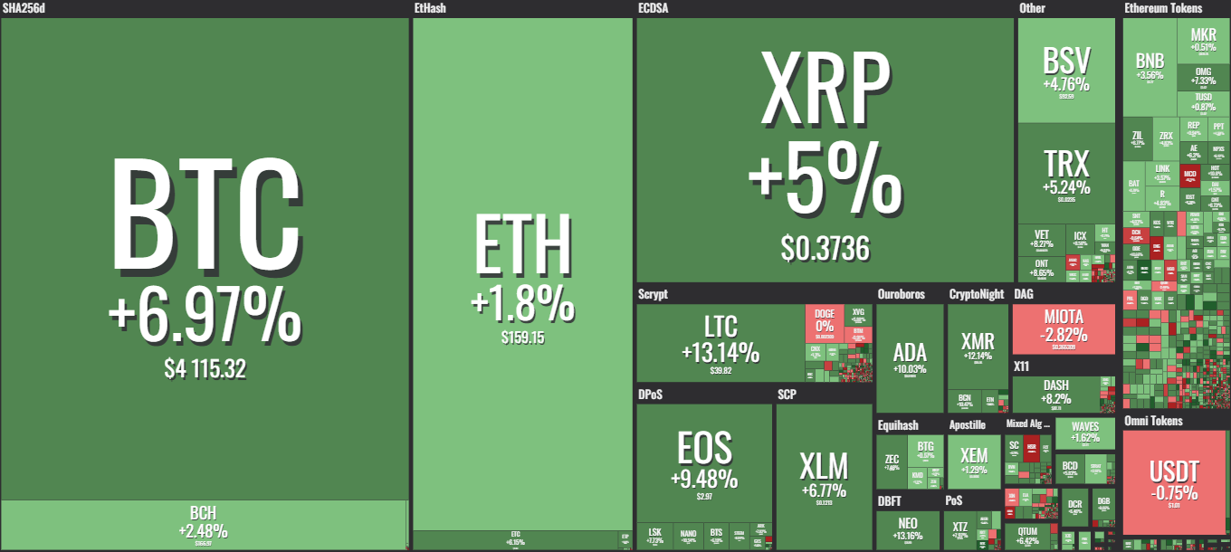 Following the surge of almost $7 billion in the overall marketcap, almost all of the cryptocurrencies have shown major signs of greens signalling the building of a positive momentum. Against the expectations of most analysts and market predictors, Bitcoin has crossed the resistance of $4,100 which is a huge positive sign.