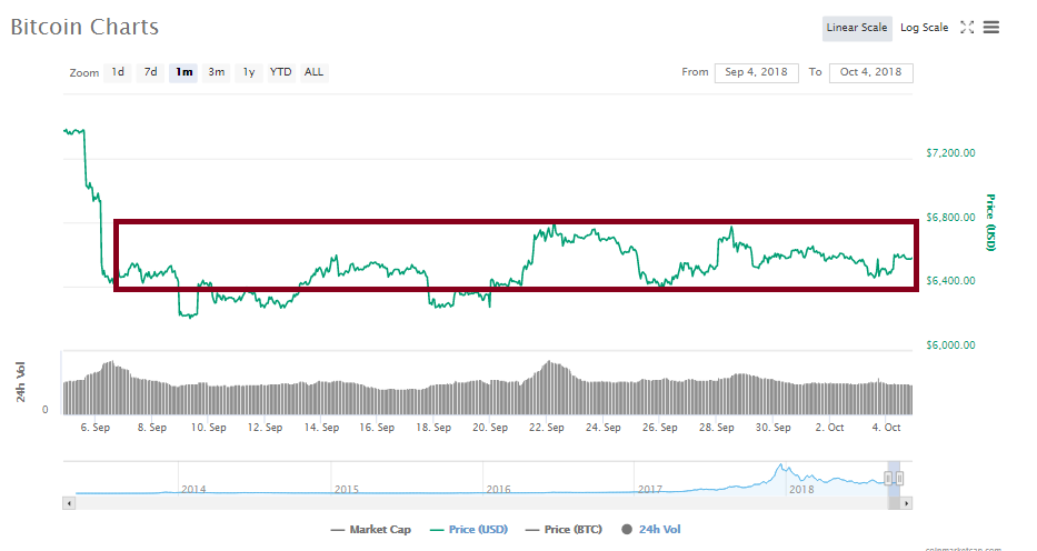 Since September 6, Bitcoin has converged into a small price range, rarely leaving the edges of the channel. The lower edge of this zone is near $6,200 with the upper limit on $6,800.