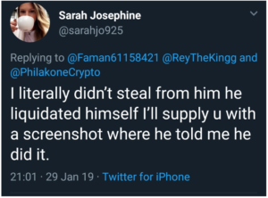 Sarah herself responded to this by denying the accusations against her and even put up screenshot of their previous conversation as evidence of him “Liquidating himself” all by himself.