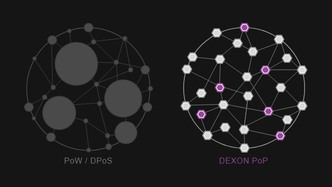 DEXON incorporates a symmetric design implemented in its PoP (Proof-of-Participation) block mining, in which every node has equal voting power, ensuring impartial network decentralization. Furthermore, since DEXON’s blocklattice maintains a constant network communication overhead, regardless of how large the transaction throughput grows, it can easily scale to thousands of nodes. Such growth implies a limitless networking system.