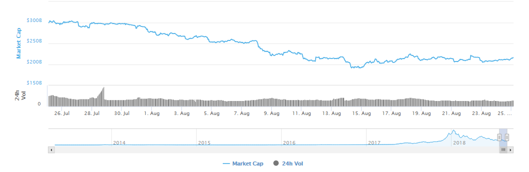 The coin market has shown signs of growth finally after a long run of bearish behavior. The market has been into dark days for the past month. The market capitalization hit $303 billion at the end of July, but everything went downhill from there. The market capitalization stooped to $191 billion, losing almost 37% of its value, but for the past few days, the currencies have seen a slight bullish pattern with signs of stability which is pushing its way to a gradual increase.