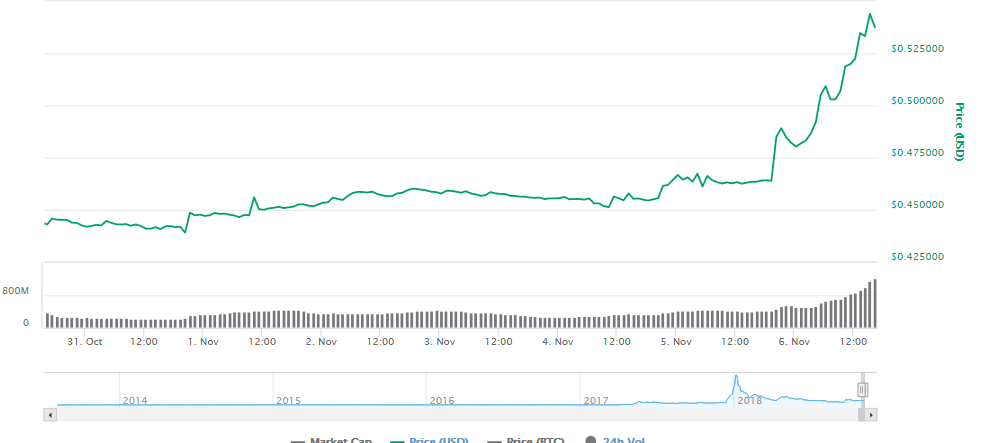 XRP was one of the most talked about currency last month when it showed exponential growth giving the investors a moment to celebrate. The market capitalization significantly increased putting it in the game with ETH, the market then faced a few setbacks due to which XRP landed back in the 40 cents area. Recently, the currency has surged again in terms of valuations and hence the market capitalization. The graphs show exponential growth overnight,
