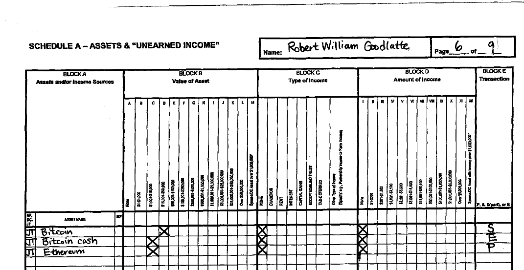 Goodlatte’s annual financial disclosure document went into filing on May 10, earlier this year before a memo went into effect that revealed the congressman’s possessions and transactions of cryptic assets of worth between $17,000 and $80,000. He is reported to have holdings of Bitcoin primarily as well as nominal amounts Bitcoin Cash and Ethereum. Bobby Goodlatte Jr., Rep. Goodlatte’s son, is an investor in American digital assets company Coinbase, and it has been speculated it is this connection that originally got the congressman into crypto.